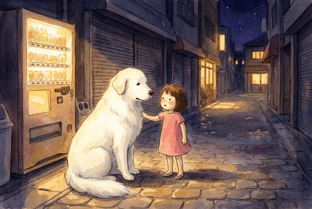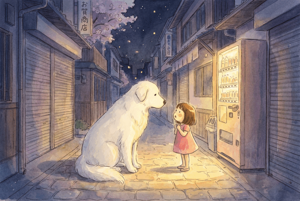 しんとした真夜中の商店街。自動販売機の光だけがぽつりと灯る道を、大きな白い犬がゆっくりと歩いていました。ふと、路地裏から小さな女の子が顔を出し、犬と目が合います。女の子は少し驚いた表情で、じっと犬を見つめていました。