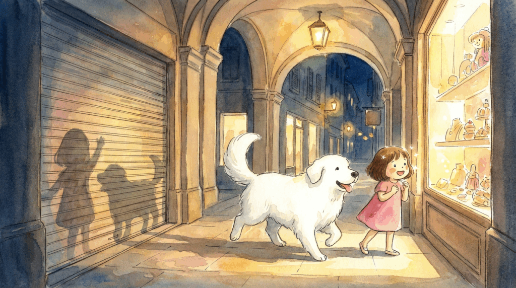 最初は戸惑っていた女の子ですが、白い犬の優しい瞳に心を開き、そっと手を伸ばしました。犬も優しく応え、二人は手を取り合って真夜中の商店街を歩き始めます。普段は賑やかな商店街も、この時間ばかりは二人の貸し切りです。