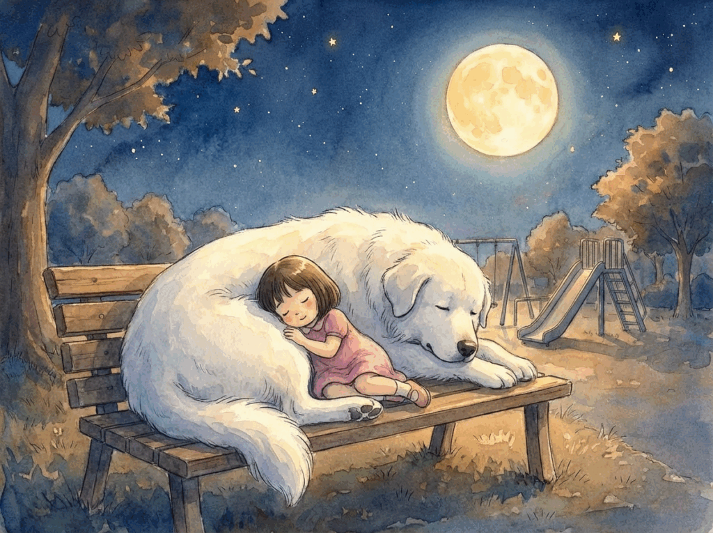 やがて、女の子は大きな白い犬の温かい体にそっと寄りかかり、すやすやと眠りにつきました。犬もまた、目を閉じて、眠る女の子に寄り添います。真夜中の公園で、二人は穏やかな眠りの中、素敵な夢を見ているのでした。
