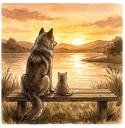 目を覚ました子猫は、山犬の毛並みに顔をうずめ、ゴロゴロと喉を鳴らしました。山犬もまた、子猫の小さな体を慈しむように見つめています。かつての恐怖は消え去り、二人の間には温かい信頼が生まれていました。